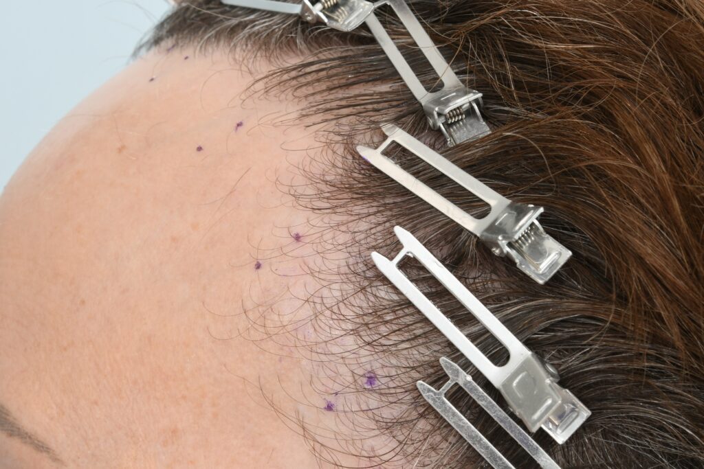 FUE involves follicular units being taken individually from the donor area of the scalp without the need for a linear incision. Instead, a 1mm specialist punch tool is used to extract the individual follicles from the scalp.