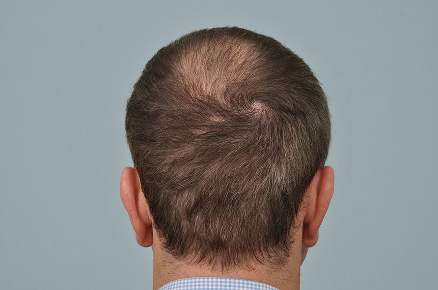 This image shows a patient with little hair growth following chemotherapy and allows the scar from his FUT procedure many years previously to be seen.
