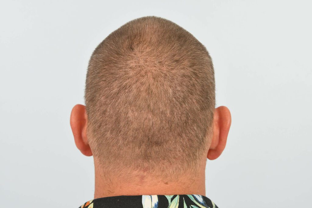 The image above shows a patient who had 2 FUT (strip) procedures a number of years previously with his head shaved for his FUE procedure. As can be seen the FUT scar is barely detectible and is easily covered by a scissors cut.
